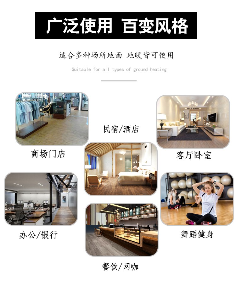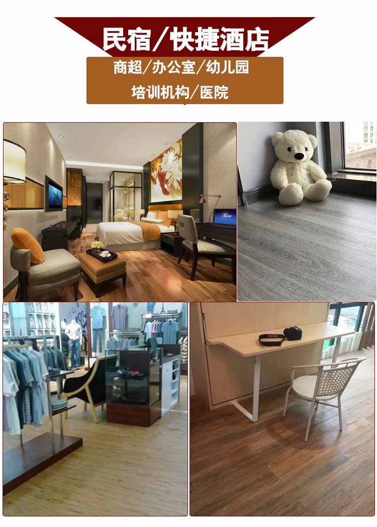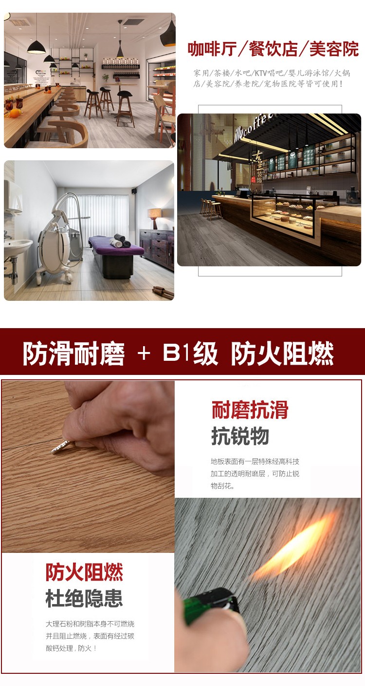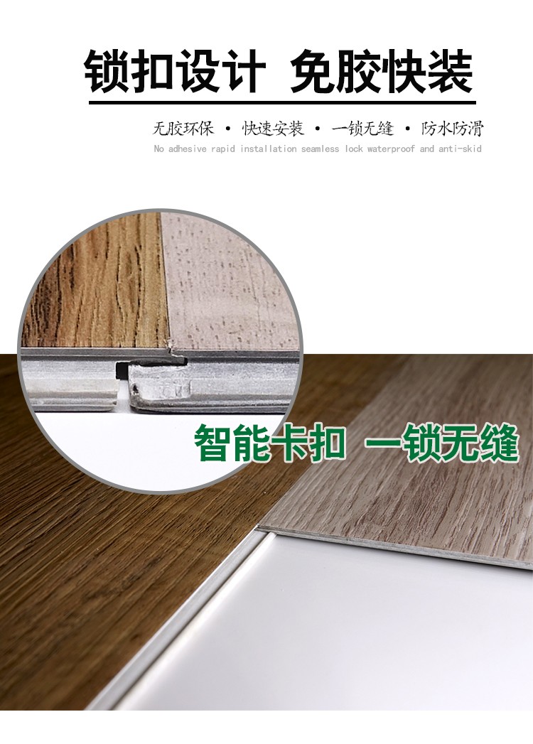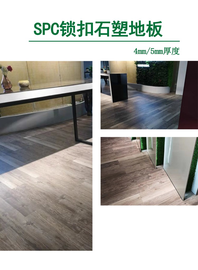 介紹:spc鎖扣石塑地板,又稱為pvc鎖扣地板,卡扣式免膠安裝 ,0甲醛環保安全 ,防水防滑,耐磨阻燃,特別合適于:酒店公寓,超市店鋪,家裝民宿,咖啡廳茶樓等場所,防火級別:B1級阻燃 ,耐磨度:T級耐磨,厚度:4mm/5mm,花紋:仿木紋,仿大理石紋,仿地毯紋